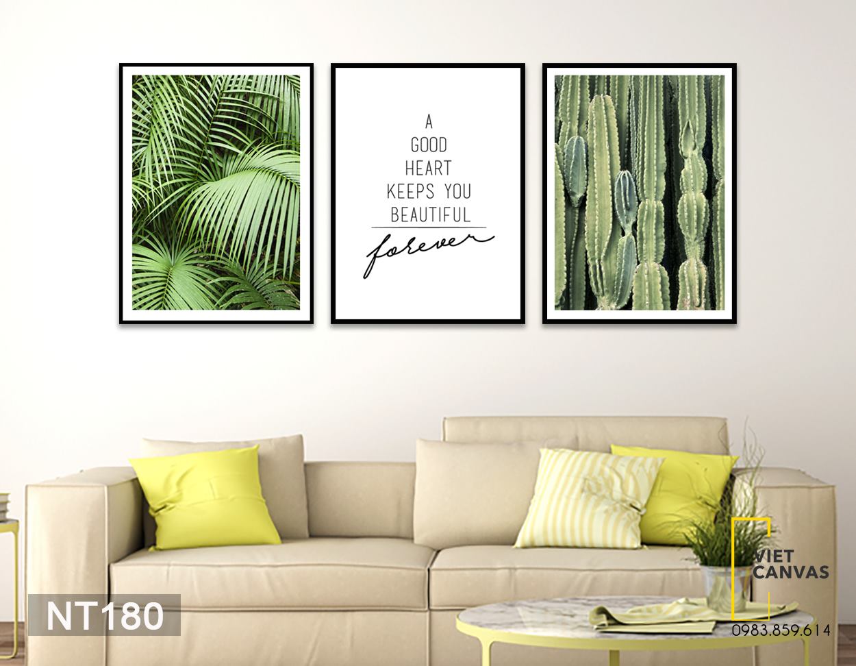 Bộ 3 Tranh Lá Cây Xanh, Xương Rồng Và Quotes A Heart Good Keeps You Beautiful - NT180